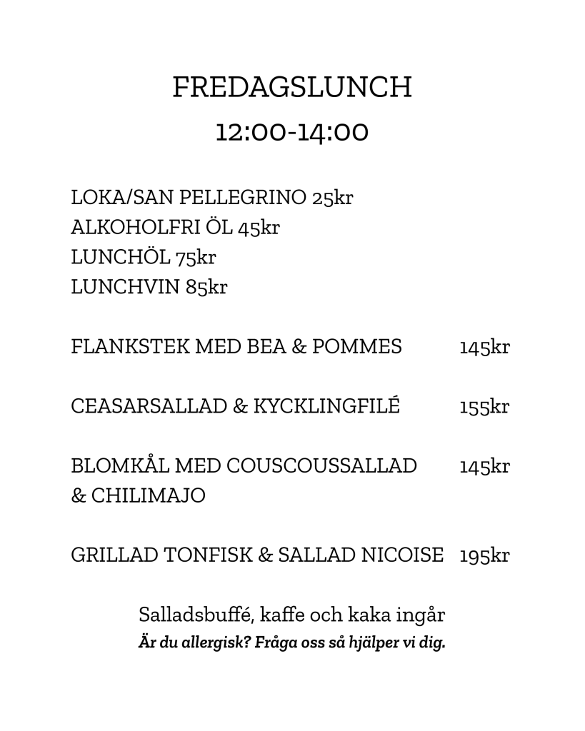 FREDAGSLUNCH (& AW)12:00-14:00 (14:00-18:00)MIDDAGONSDAG – TORSDAG16:00 – 21:00FREDAG – LÖRDAG16:00 – 22:00